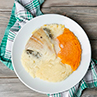 Filet de merluza, calbaza, agua, acelga, queso crema, papa en escamas, cebolla, queso tybo, leche en polvo descremada, jugo de limón, nuez moscada, caldo de verdura deshidratado. CONTIENE PESCADO Y LECHE.
